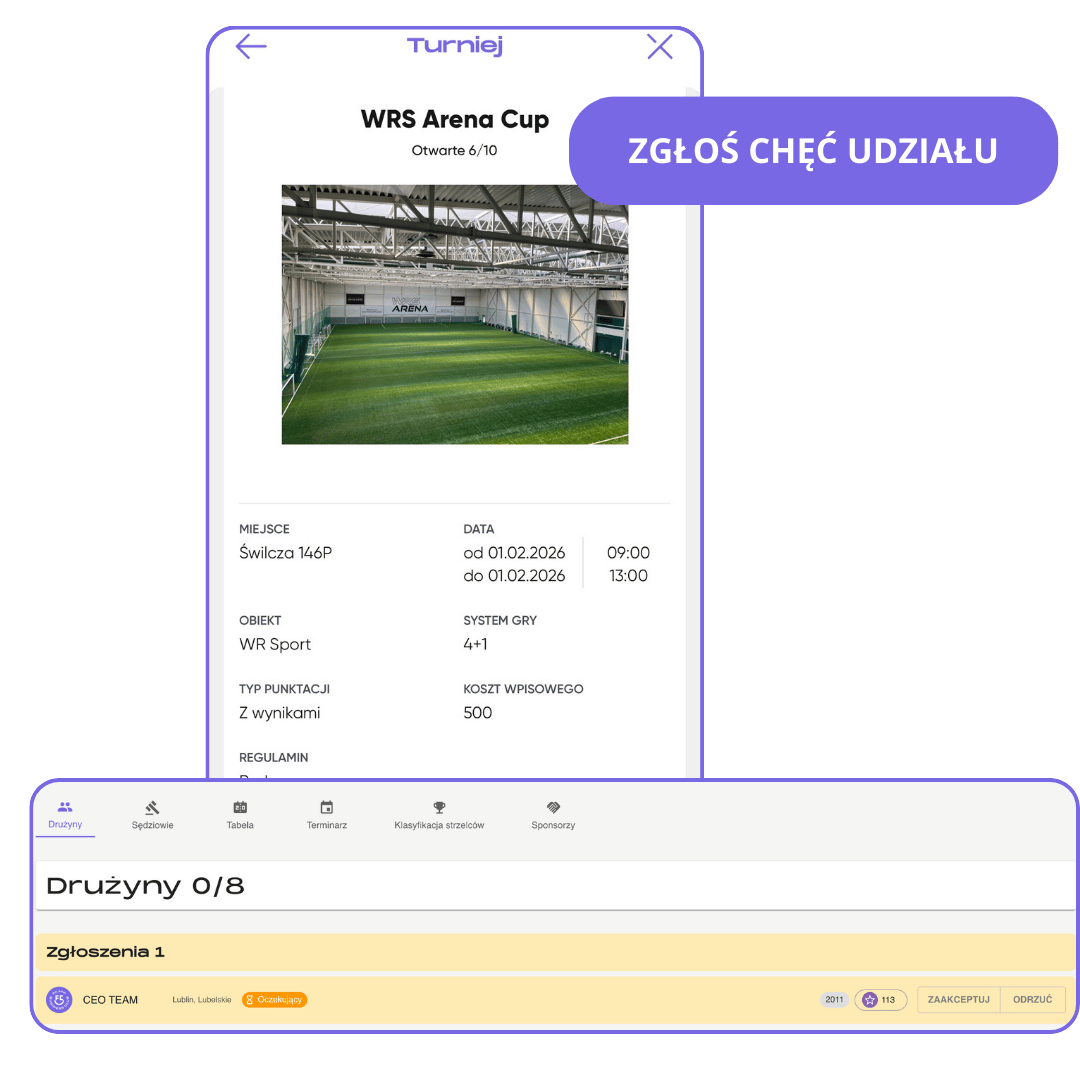 Wystarczy jeden link, który możesz udostępnić w dowolnym miejscu. Drużyny zgłaszają się do turnieju jednym kliknięciem, a Ty zyskujesz pełny podgląd zgłoszeń w jednym panelu.