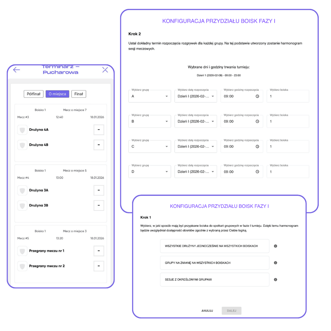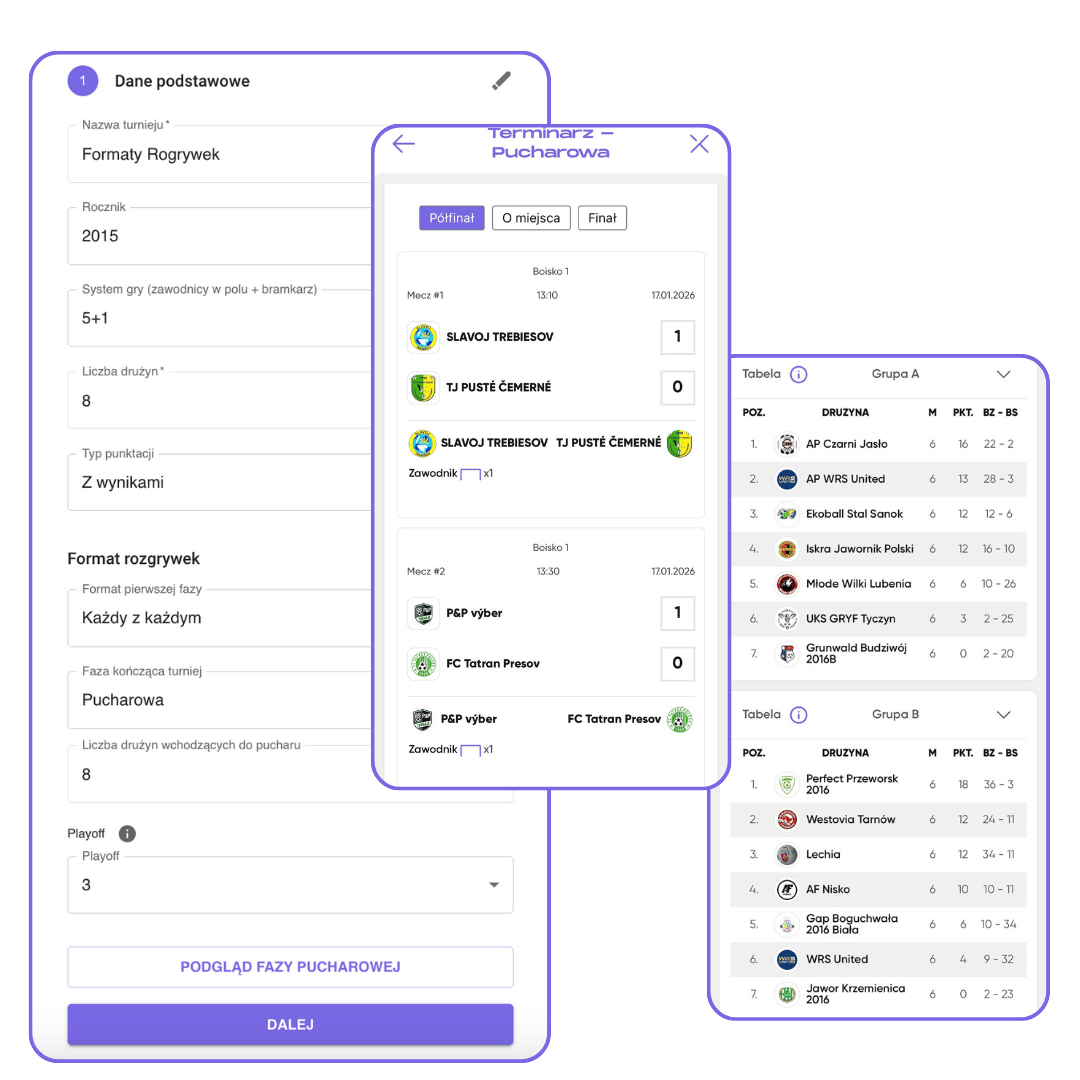 System automatycznie porządkuje strukturę rozgrywek, dzięki czemu masz jasny układ turnieju jeszcze przed pierwszym gwizdkiem, a w razie potrzeby możesz elastycznie dostosować format do bieżącej sytuacji.