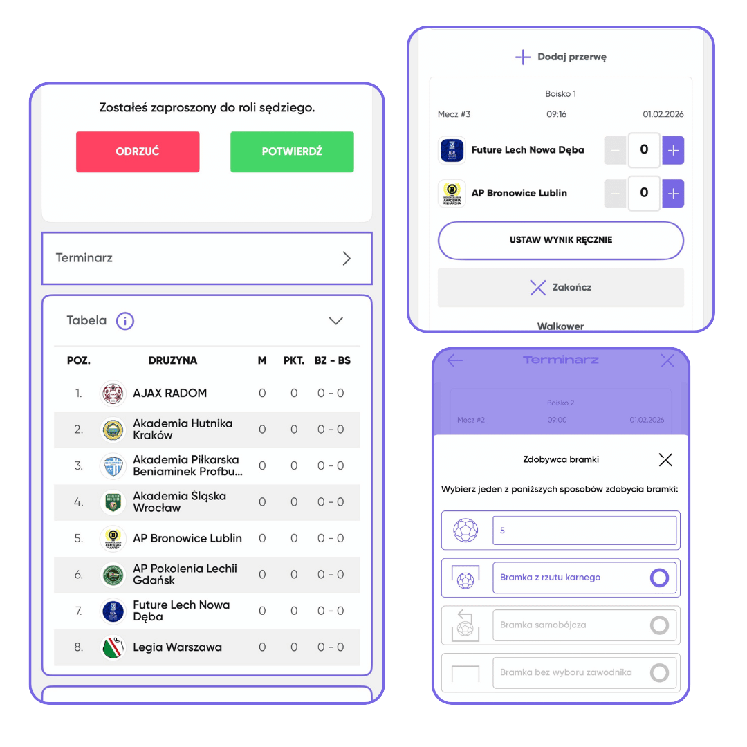 Możesz dodać dowolną liczbę sędziów, a każdy z nich uzupełnia wyniki bezpośrednio ze swojego telefonu – w trakcie meczu lub po jego zakończeniu. Ty skupiasz się na organizacji, a wyniki aktualizują się na bieżąco.
